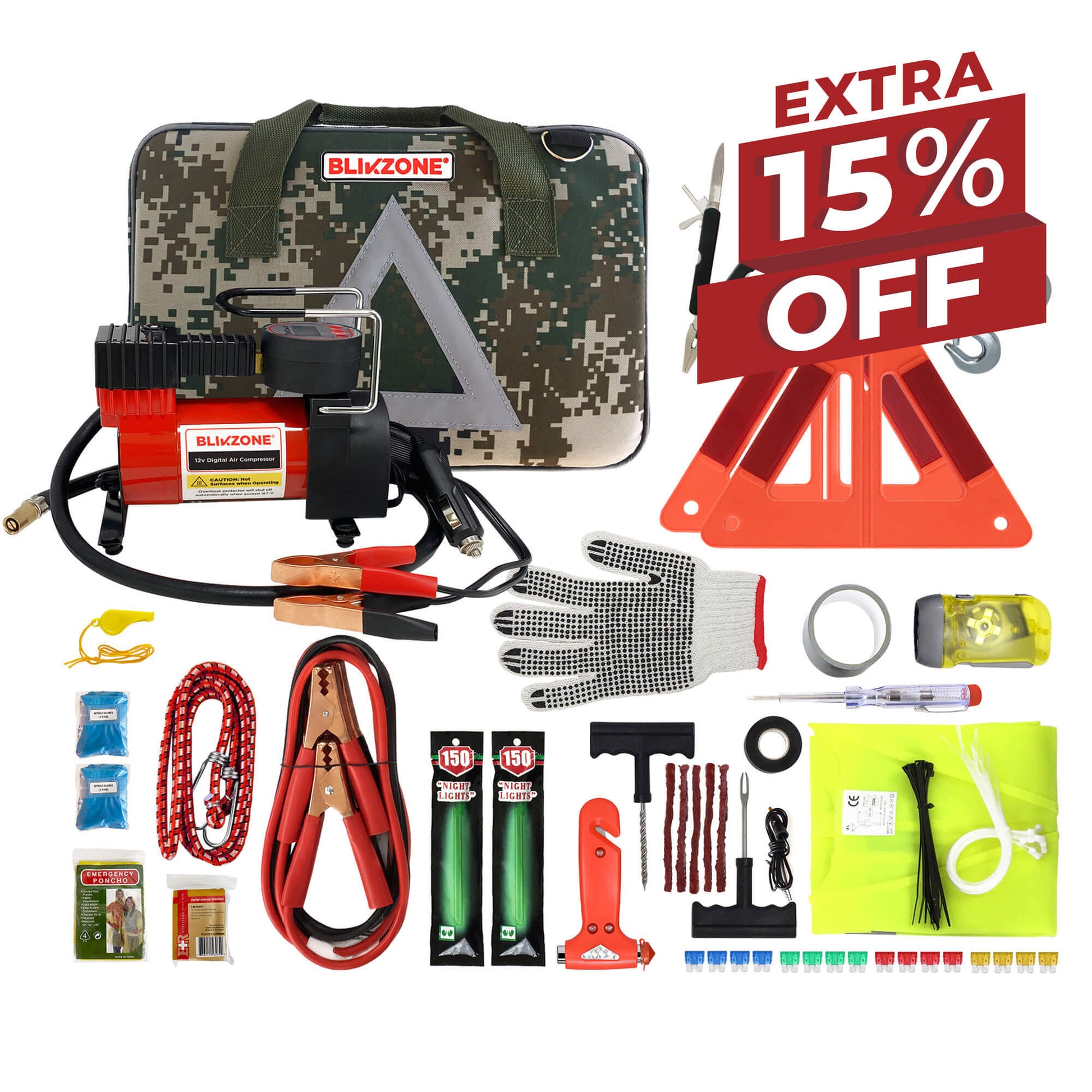 Blikzone Car Emergency Safety Kit with Digital Air Compressor for Car